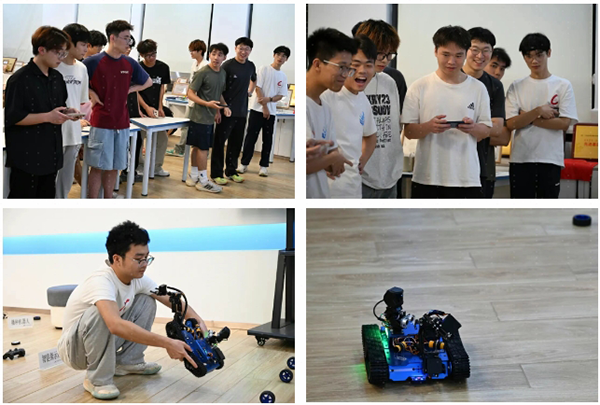 淘汰赛环节,在小组内紧密配合,各小组之间相互追逐、相互对抗。现场设置的赛道复杂,机器人在学生的操作下却灵活穿梭,跨越障碍、精准交接。选手操控表现沉着,意外状况也不慌,尽显科技魅力与团队协作。最终四支队伍突破重围,晋级决赛。